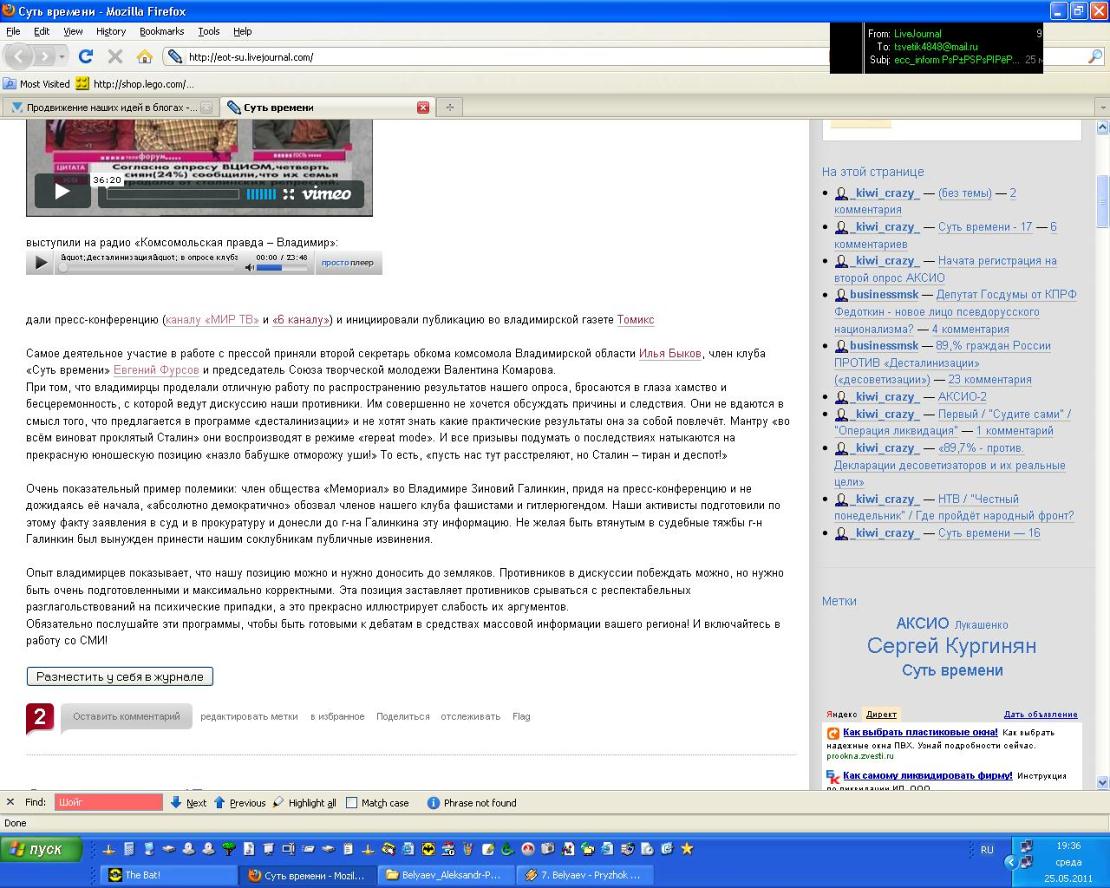 Ну, наконец-то, и нам найдется дело. Ссылка http://eot.su/node/2755) приведена неудачно, закрывающая скобка прилипла к url и тащит на несуществующую страницу. Исправил. Не будет грехом, если я буду действовать в Гайдпарке? Ведь он развивается очень быстро и администрируется неплохо. Или будете настаивать, чтобы на первом этапе сосредоточиться на http://www.livejournal.com ? или Блог центра Кургиняна http://ecc-inform.livejournal.com ? Представляется, что экспансия продвижения наших идей в блогах только выиграет, если охват сети будет расширяться. Сосредоточьтесь на том, что вам ближе. А в блогах просто зарегистрируйте на livejournal.com, добавьте в друзья ecc-inform.livejournal.com и подпишитесь на его рассылку, это займет не больше 15 минут. Сообщение отредактировал Good - 25.5.2011, 11:06 |