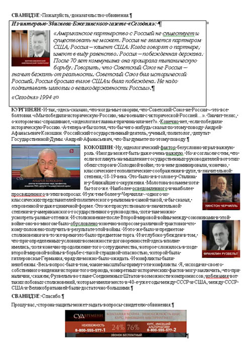 А вообще надо сделать какой-нибудь образцово показательный экземпляр, вывесить его для общего обозрения. Вообще, по моему мнению, единая группа документов должна быть (по возможности) в едином стиле. Это и для последующей обработки удобно: можно некоторые операции макросами автоматизировать. Примеры оформления показывались ранее. См. стр. 3, 5. Сделать образцово-показательный экземпляр, чтобы он удовлетворял вкусы всех, сложно, да и не нужно. Здесь же нет принудиловки. Кто как умеет, кто как хочет. Главное - идентичность текста видеозаписи.Пример оформления Vitalis'а с картинками. Наглядно, но не обязательно. Я бы только не набирал фамилии прописными буквами целиком. ->Кургинян: Цитата Po100ronniy - Я грежу сайтом для продолжения дискуссии. Чтобы был сайт, необходимо:1. Проработать идею сайта, что, почему и зачем. 2. Решить вопрос, кто будет финансировать создание и функционирование сайта. И как скоро ему это надоест. 3. На основе идеи разработать техпроект. 4. По техпроекту изготовить сайт. 5. Запустить в работу и поддерживать её. Пункты 3-4-5 - для специалистов. Самый важные пункты 1 и 2. Сайт такой - пропагандистско-агитационный. Нужен заказчик такой агитации. |