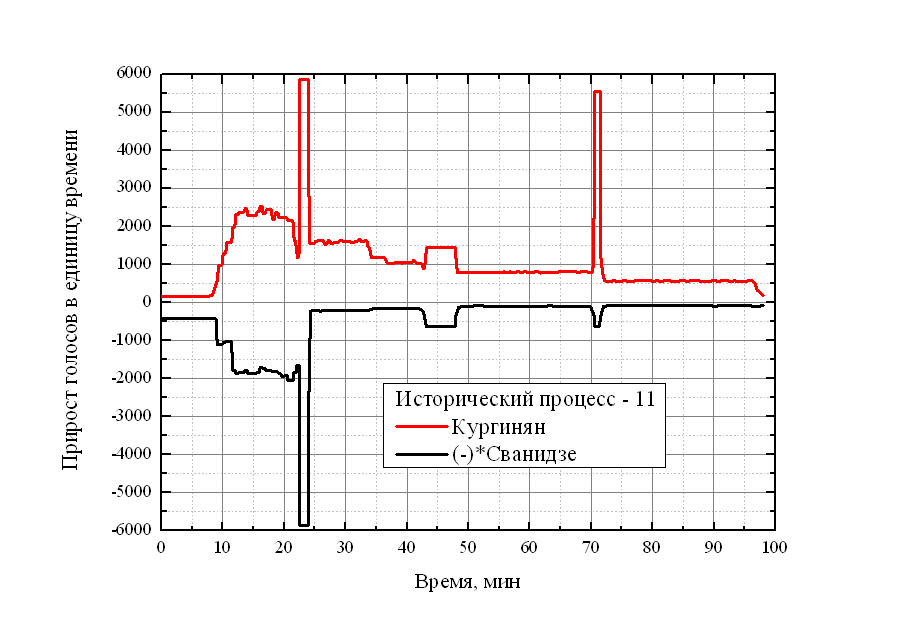 Так что даже если не делали вбросов. То сторонники чубайса вполне могли проголосовать. Он активно анонсировал свое участие в передаче. Хотя резкий набор голосов в первой части передачи говорит о чем-то не чистом. Вброс делали. Можно считать это доказанным фактом. Никакие другие объяснения такого резкого спада частоты голосований за сванидзе посто невозможны. Причем четко после перерыва - как отрезало! Если бы сторонники голосовали, то они бы голосовали в течение всей передачи, а тут - картина совсем другая. Смотрите сами: ![]() |