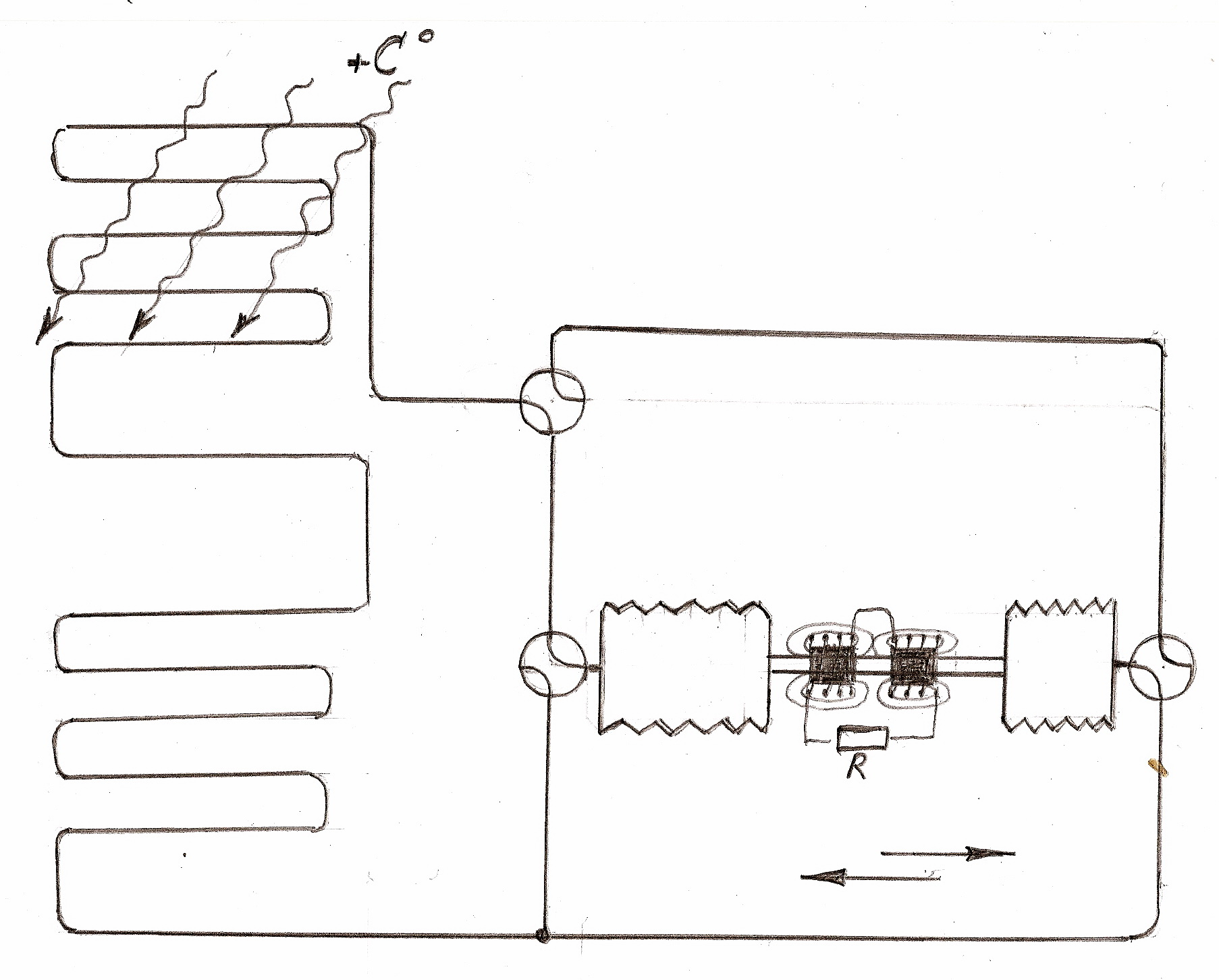 В Саратове выпускались бескомпрессионные фреоновые бытовые холодильники..( у меня на даче такой холодильник работает с 1968 года!!!) испарение фреона происходит в перепаде 4 градусов....например при 19 град фреон в жидком состоянии, а при температуре 23-24 град. он уже в парообразном состоянии. Вот мы имеем прекрасный теплоноситель, способный работать в обычном паровом двигателе..., а если убрать поршни и цилиндры и заменить их сильфонами -гармошками, то перепуская по очереди пар в одну и другую гармошку можно получить мощный двигун (при диаметре 100 мм. сильфона усилие , толкающее будет 100 кг...или 1000 н. поставив маховик с двумя обгонными муфтами можно его раскручивать с постоянной силой в 1000 н...с маховика снимаем момент на электрогенератор...получили домашнюю электростанцию... Теперь о теплоносителе...один радиатор ставим на крыше, а друго вокруг печной трубы на чердаке... и зимой получаем непрерывно электроэнергию, а летом...ну летом вы и сами сообразите....Вся система полностью замкнута, никаких сальников даже на перпускных клапанах (есть такие конструкции. А вот и схема... http://www.kurginyan.ru/board/style_images...e_types/gif.gif |