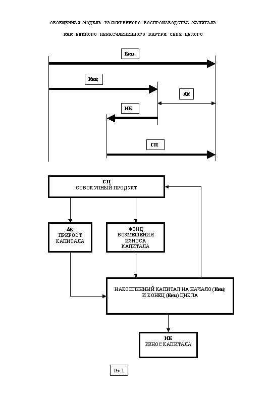 Предисловие. Предмет политической экономии. ПОЛИТИЧЕСКАЯ ЭКОНОМИЯ - ЭТО НАУКА О ЗАКОНАХ РАЗУМНОГО УПРАВЛЕНИЯ ОБЩЕСТВЕННЫМ РАЗВИТИЕМ. Другие законы изучаются в рамках других наук, поэтому в рамки предмета политической экономии попадают способы производства общественной жизни как единства цели общественного развития и формы общественных связей. Всё остальное рассматривается постольку, поскольку человеческое общество является частью природы в целом и взаимодействует с ней. Капитал - центральное понятие политической экономии. С абстрактно общего определения капитала политическая экономия начинает и последовательно восходит к конкретно всеобщим определениям. АБСТРАКТНО ОБЩИЕ ОПРЕДЕЛЕНИЯ КАПИТАЛА Капитал - это самовозрастающий живой общественный организм. В предельно общем смысле капитал есть общественный организм, целесообразно и разумно воспроизводящий себя в расширенном масштабе. КАПИТАЛ - это богатство (благо, ценность, стоимость, полезность, достояние и т.п.) используемое как средство производства еще большего богатства. Капитал представляет собой общественно-полезное единство материальных и духовных факторов производства, где творческая сторона рабочей силы человека является системно образующим фактором. С позиций современного естествознания все ресурсы природы, включая рабочую силу человека, можно рассматривать как обобщенные источники мощности. Взятые сами по себе, они есть стихийные силы природы (сокрытые вещи, сокровища, вещи сами по себе), но не капитал. Взятые в единстве с разумной рабочей силой человека и используемые для своего возрастания, они суть капитал. Другими словами, мы можем определить капитал как единство всех природных ресурсов с разумной рабочей силой человека в процессе самовозрастания или как обобщенную мощность, направленную на производство еще большей мощности в общественно-полезной форме. Ценность обобщённой мощности как капитала определяется величиной и умением пользоваться, что в свою очередь зависит от количества знаний, уровня развития мышления и системы производственных отношений. Капитал не есть фактор производства наряду с другими факторами производства. Капитал есть единство всех факторов производства в процессе самовозрастания в общественно-полезной форме. ТРУД - это способ преобразования вещей самих по себе, то есть СОКРОВИЩ, в вещи для нас в общественно полезной форме, то есть в КАПИТАЛ. Другими словами ТРУД ЕСТЬ ЖИЗНЬ КАПИТАЛА, способ его существования. Наглядно процесс общественного воспроизводства капитала можно интерпретировать следующей геометрической иллюстрацией (см. рис.1) 1) процесс износа капитала, иначе это называют потреблением, который включает в себя износ накопленного капитала за предшествующий период и износ капитала вновь произведенного за последний расчетный период; 2) процесс производства капитала, который включает в себя создание фонда возмещения текущего производственного износа капитала и фонда процента на капитал. Фонд процента на капитал образует фонд накопления. Отношение фонда накопления к накопленному капиталу называется нормой накопления или просто процентом на капитал. Из выше изложенного следует, что процент на капитал является интегральным показателем темпа общественного развития. Стремясь максимизировать темпы обще