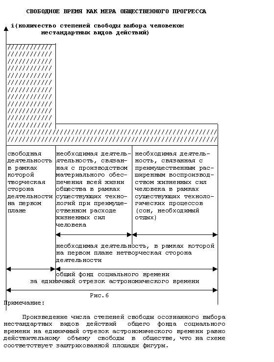 Рассмотрим критерий уровня общественного исторического развития. С нашей точки зрения это критерий свободы. То есть общество развивается от состояния минимальной свободы к состоянию все большей свободы. Обратный процесс называется регрессом. Однако необходимо разобраться с самим понятием индивидуальной и социальной свободы. Необходимо различать множество физических степеней свободы, которое включает в себя множество осознанных степеней свободы, которое включает в себя и множество осознанных нестандартных степеней свободы. Только число степеней свободы осознанного выбора нестандартных действий может выражать действительный объем индивидуальной свободы, а с учетом ограничений на социальный произвол и социальный объем свободы в обществе. Величина свободы выражает величину такого фактора производства капитала как мышление. Рассмотрим простейшую диаграмму см. рис. 6 Ось ординат показывает число степеней свободы осознанного выбора нестандартных действий в тот или иной момент времени, а по оси абсцисс отложен единичный фонд социального времени за единичный отрезок астрономического времени. Площадь плоской фигуры на диаграмме равна объему свободы. Эта площадь представляет собой сумму двух площадей, где одна площадь выражает объем свободы в условиях, когда творческая сторона деятельности на первом плане, а вторая площадь выражает объем свободы в условиях, когда репродуктивная сторона деятельности на первом плане. Свободная деятельность есть необходимая деятельность для совершенствования средств производства, технологических процессов, самой разумной личности, системы производственных отношений и общества в целом. Творческая сторона деятельности тут на первом плане. Эта деятельность непосредственно необходима для развития и является трудом, в наибольшей степени соответствуя этому понятию. Репродуктивная деятельность есть необходимая деятельность в рамках стандартных технологий, что позволяет производить соответствующее материальное обеспечение для всей жизни. Эта деятельность является трудом постольку, поскольку подчинена разумной цели производства условий для свободной деятельности. Более того, творческая сторона деятельности и в стандартных условиях имеет место, хотя бы и на заднем плане. Классиками политической экономии отмечалось, что по мере исторического развития граница между свободной и репродуктивной деятельностью смещается в сторону увеличения доли свободной деятельности. Карл Маркс, на пример, исторический период, в течение которого доля свободной деятельности в социальном фонде времени увеличивается от нуля к единице, характеризовал как предысторию человечества. Истинная история человечества начинается по Марксу тогда, когда доля репродуктивной деятельности равна нулю. Это мнение разделял, в целом, Побиск Георгиевич Кузнецов. С нашей точки зрения это не совсем точно. В какой оптимальной пропорции делится социальный фонд времени, зависит от максимизации темпов развития, то есть от объёма свободы, объёма творчества. Этот параметр изменяется от нуля к бесконечно большой величине. Никакого конца истории здесь не просматривается. Граница между рассматриваемыми двумя основными типами деятельности гуляет в обе стороны и сама по себе ни о чем не говорит. (Продолжение следует) Соо